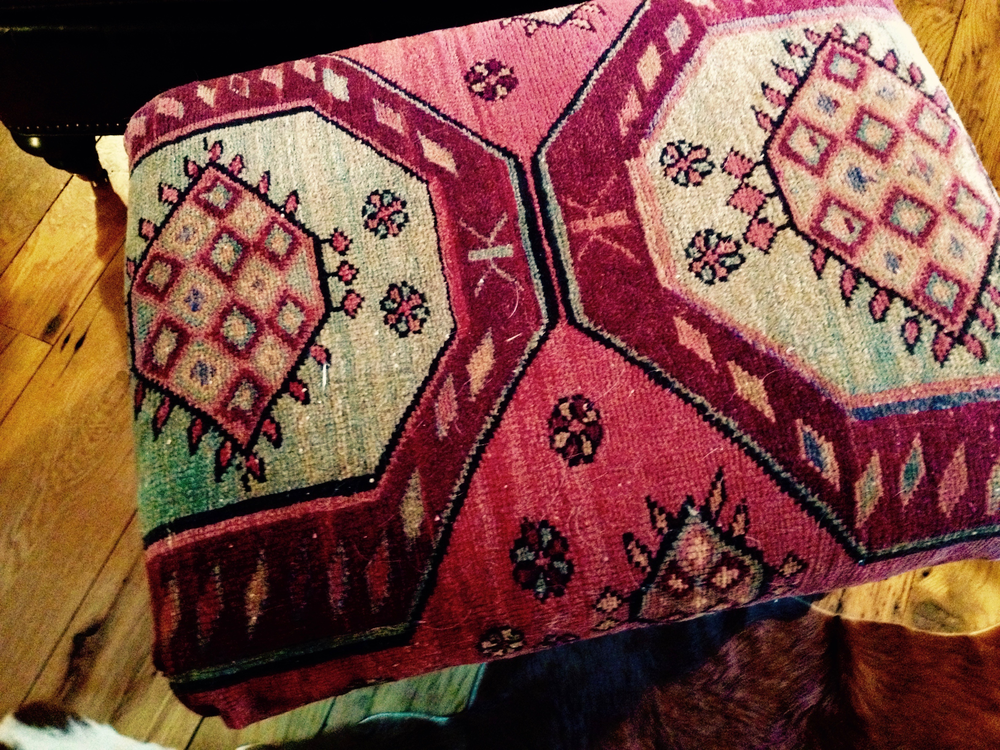 Our inspiration was a gorgeous antique Kilim rug and we used it to cover an ottoman. It looks fabulous and gives the room an instant heirloom quality.