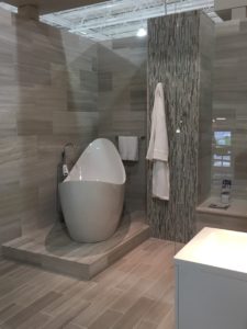 Large thin cut porcelain slabs — These porcelain slabs mimic marble or exotic stone and they are fabulous! They are incredibly realistic and can fool even the most discerning eye. The slabs come in size up to 60″ x 120″. Because the slabs are cut thin, the large size can be applied to a vertical surface. The weight is not an issue. These tiles are awesome for commercial applications or large spans of wall, such as showers and baths. They offer a very high-end look of exotic natural stone, but at fraction of the cost.