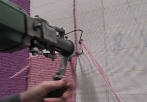 Hand tufted rugs are made with a tufting gun.  The rug is made using a pre-constructed form (think of a needlepoint or cross stitch fabric) and the yarn is hooked and pulled through the surface.  The backs of these rugs are usually coated with vinyl or cotton to help the rug maintain its shape.  Most hand-tufted rugs are wool and generally moderately priced.