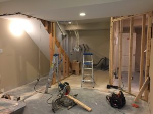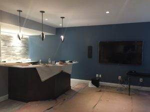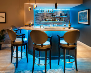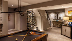 Our client asked that the basement plan include a full bar. When considering the layout, the spot for the bar was obvious. There was a small rectangular area at one end of the room which was not ideal for seating and was too tight for the pool table. This space was adjacent to an unfinished storage room and the HVAC closet. This allowed for easy access to plumbing and less issues for running electrical wires.