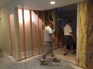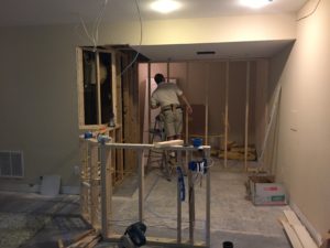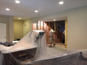 Just past this landing area, there was a long wall that took a sharp right turn into the room. It was visually blocking and impeded flow. We cut this wall back and rebuilt it on an angle. This felt more open and softened the entrance into the room.