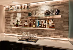 The bar design is simple, clean and masculine. We selected a dark slab front cabinet with modern hardware. The counters are white quartz and the back wall features grey porcelain ledgestone with floating glass shelves for bottle display.