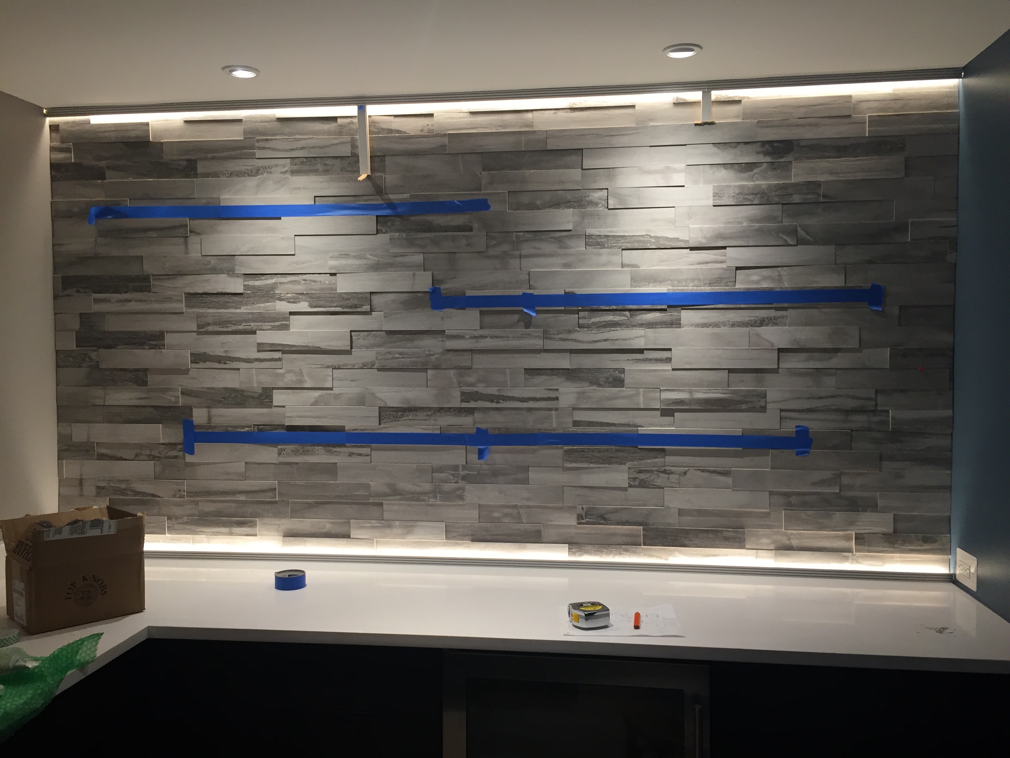 Stunning Basement Retreat » Stone wall bar floating shelves